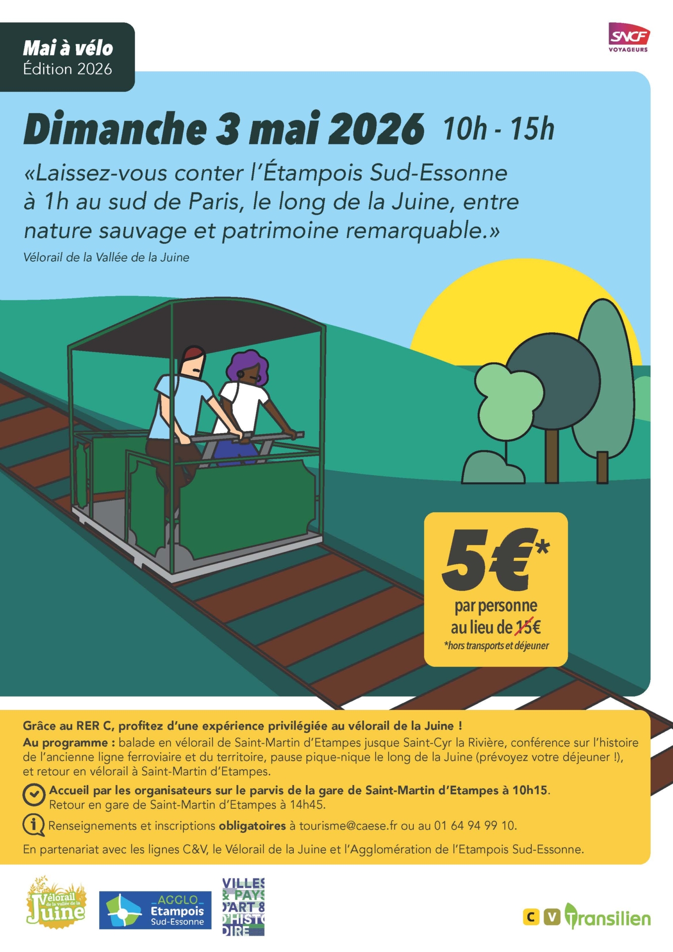 đČ Mai Ă vĂ©lo â SNCF Voyageurs DĂ©tails de l'Ă©vĂšnement : DĂ©but : 3 mai 2026 10 h 00 min CatĂ©gories : CDEA, Loisirs  Dimanche 3 mai 2026 | 10h â 15h Dans le cadre de lâĂ©vĂ©nement national Mai Ă vĂ©lo, SNCF Voyageurs propose une expĂ©rience originale et conviviale au VĂ©lorail de la VallĂ©e de la Juine. GrĂące au RER C, profitez dâune sortie accessible et dĂ©paysante Ă 1 heure au sud de Paris, au cĆur de lâĂtampois SudâEssonne, entre nature sauvage et patrimoine remarquable. đŽââïž Au programme : Balade en vĂ©lorail de SaintâMartinâdâĂtampes Ă SaintâCyrâlaâRiviĂšre ConfĂ©rence sur lâhistoire de lâancienne ligne ferroviaire et du territoire Pause piqueânique le long de la Juine (prĂ©voir son dĂ©jeuner) Retour en vĂ©lorail jusquâĂ SaintâMartinâdâĂtampes đ Accueil par les organisateurs đ 10h15 â Parvis de la gare de SaintâMartinâdâĂtampes đ Retour en gare đ 14h45 đ© Renseignements et inscriptions obligatoires âïž tourisme@caese.fr âïž 01 64 94 99 10 đ€ En partenariat avec les lignes C & V, le VĂ©lorail de la Juine et lâAgglomĂ©ration de lâĂtampois SudâEssonne