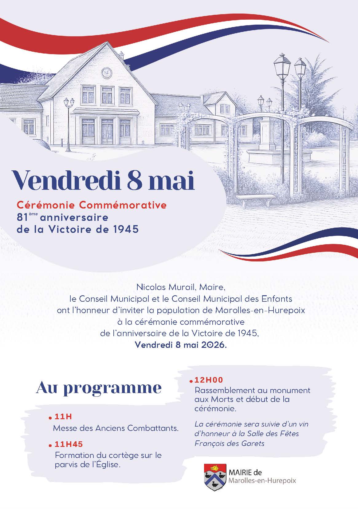 Cérémonie commémorative du 08 mai – 81ième anniversaire de la Victoire de 1945 Détails de l'évènement : Début : 8 mai 2026 11 h 00 min Catégories : Mairie Commémoration du 81ᵉ anniversaire de la Victoire du 8 mai 1945 Nicolas Murail, Maire de Marolles‑en‑Hurepoix, le Conseil Municipal ainsi que le Conseil Municipal des Enfants ont l’honneur de vous inviter à la cérémonie commémorative du 81ᵉ anniversaire de la Victoire du 8 mai 1945, qui se déroulera le vendredi 8 mai 2026. 🕊️ Programme de la matinée 11h : Messe des Anciens Combattants 11h45 : Formation du cortège sur le parvis de l’église 12h : Rassemblement au monument aux morts et début de la cérémonie La cérémonie sera suivie d’un vin d’honneur à la Salle des Fêtes François des Garets. 🎶 Chorale des enfants Une chorale d’enfants est prévue lors de la cérémonie. 👉 Les familles souhaitant inscrire leur(s) enfant(s) sont invitées à remettre le coupon distribué par l’école directement à la mairie. 📞 Pour toute information complémentaire, merci de contacter la mairie.