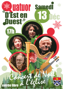 Concert de Noël 2025 Détails de l'évènement : Début : 13 décembre 2025 17 h 00 min Lieu : Eglise Catégories : Culture Concert de Noël avec le quator « d’Est en Ouest » Entrée gratuite.