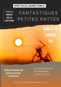 Fantastiques petites pattes Détails de l'évènement : Début : 24 janvier 2026 16 h 00 min Lieu : Médiathèque Marolles Catégories : Culture Spectacle « Fantastiques petites pattes » avec le conteur Vincent Comte. Fanette, petite fourmi téméraire, part vivre la plus fantastique des aventures : la vie réelle de son monde à elle. A partir de 5 ans – Sur réservation – Gratuit