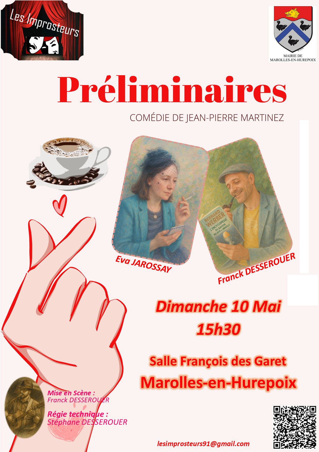 Spectacle de théâtre « Préliminaires » Détails de l'évènement : Début : 10 mai 2026 15 h 30 min Lieu : Salle des Fêtes François des Garets Catégories : Culture Un homme et une femme se côtoient chaque jour dans un café. Assis seuls chacun à une table, ils s’observent du coin de l’oeil avec curiosité, sans encore oser se parler. Vont-ils succomber au désir d’une rencontre, dont la réalité ne sera pas forcément à la hauteur de ce qu’ils avaient l’un et l’autre fantasmé ? Faire connaissance, c’est toujours réduire le champ des possibles. S’en tenir aux préliminaires, c’est risquer de passer à côté de l’essentiel… Cette comédie romantique pose une question philosophique essentielle, et plus que tout d’actualité, sur les relations hommes/femmes dans nos sociétés modernes. Tout public à partir de 10 ans. Entrée libre. Participation « au chapeau »