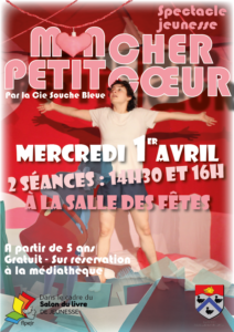 Spectacle « Mon cher petit cœur » Détails de l'évènement : Début : 1 avril 2026 14 h 30 min Lieu : Salle des Fêtes François des Garets Catégories : Culture, Jeunesse Spectacle « Mon cher petit cœur » de la Cie Souche Bleue à la Salle des fêtes. A partir de 5 ans. Gratuit – Sur réservation à la médiathèque